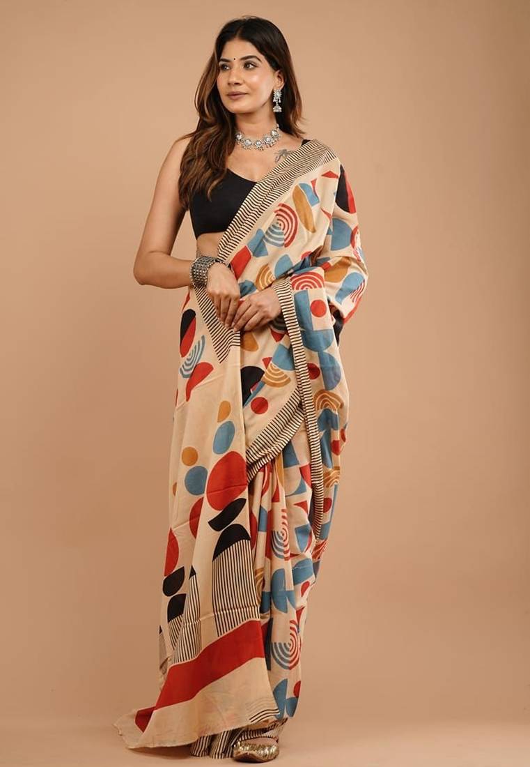 Multicolor Cotton Hand Block Printed Mulmul Sarees With Attach Printed Blouse