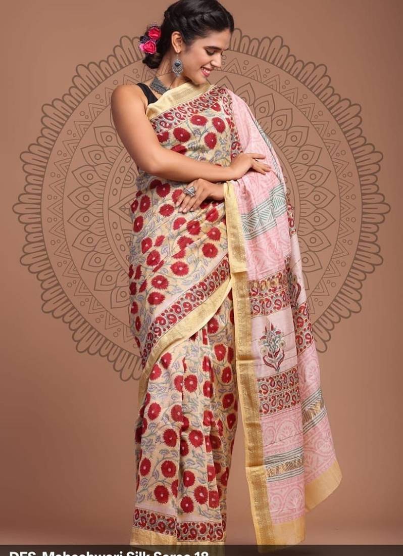 Elegant Maheshwari silk Saree with woven borders and beautiful Hand Block.