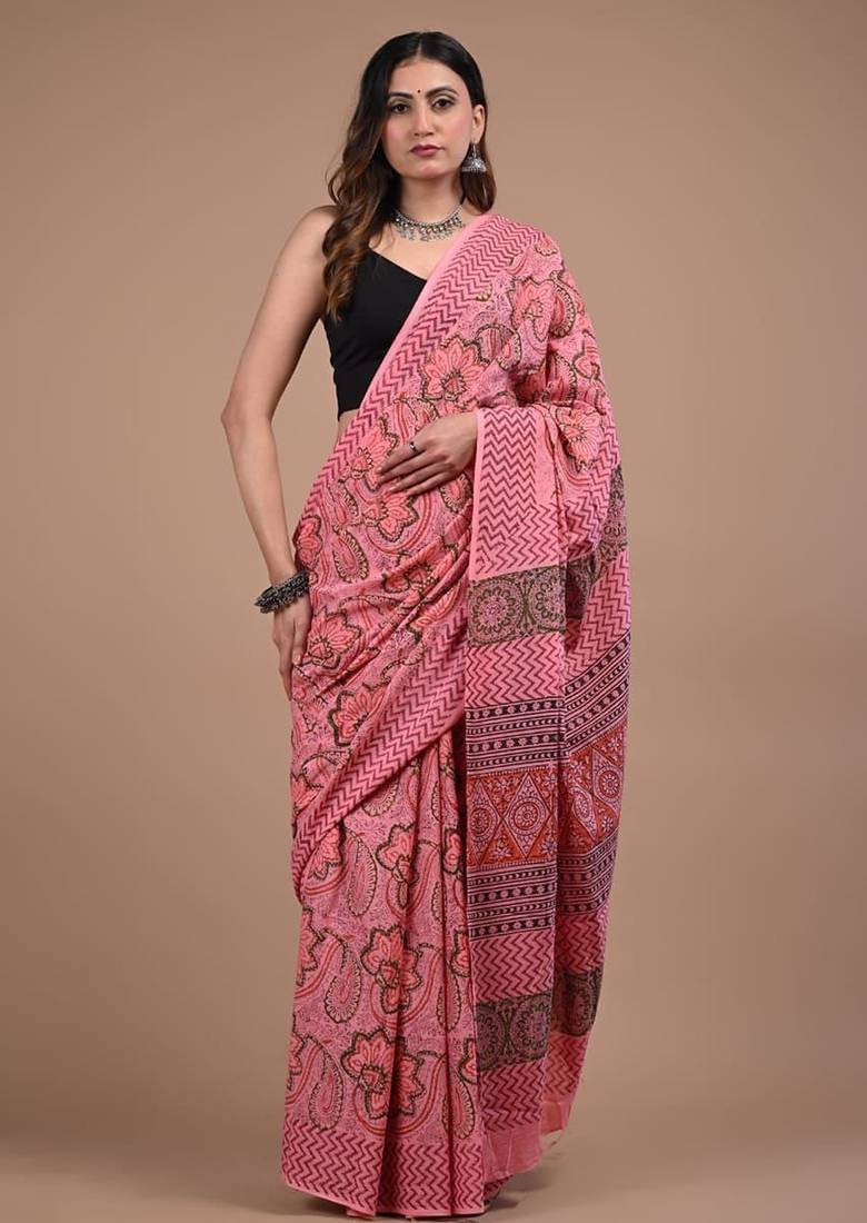 Pink Cotton Hand Block Printed Mulmul Sarees With Attach Printed Blouse