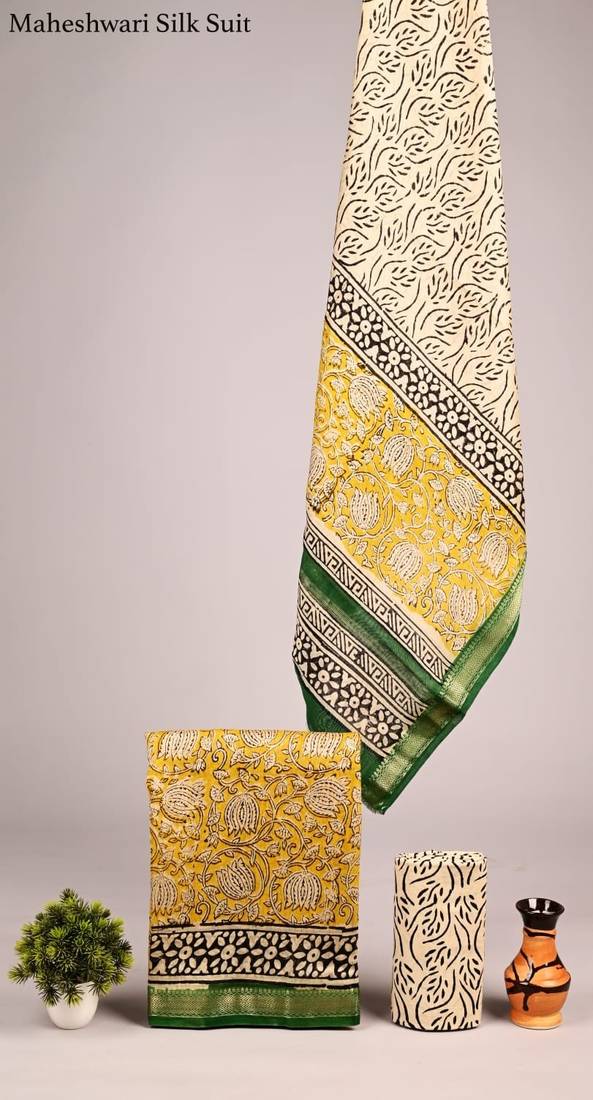 Yellow Exclusive New Hand Block Printed Maheshwari Silk Zari Border Suits Pieces Unstitched