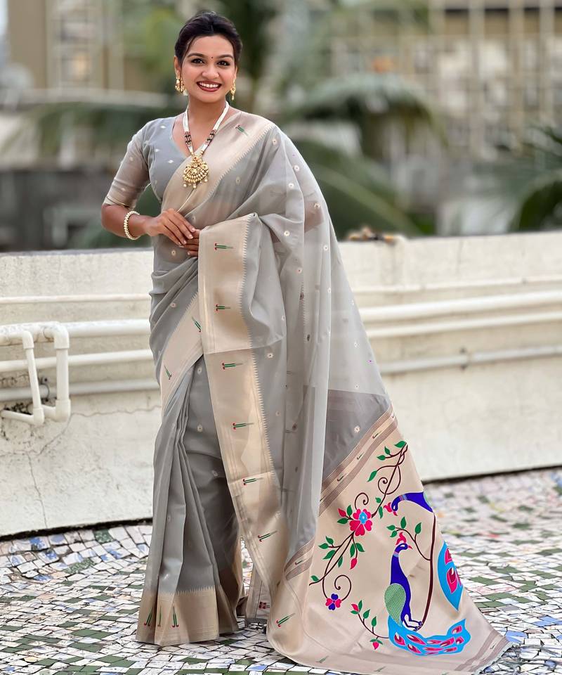 • Saree : Color- Grey / Fabric- Silk Blend • Blouse : Color- Grey / Fabric- Silk Blend Saree Details