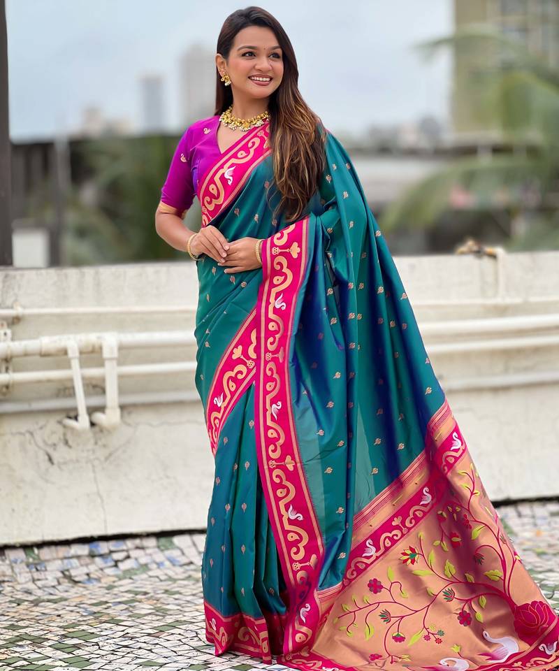 • Saree : Color- Teal / Fabric- Silk Blend • Blouse : Color- Teal / Fabric- Silk Blend Saree Details