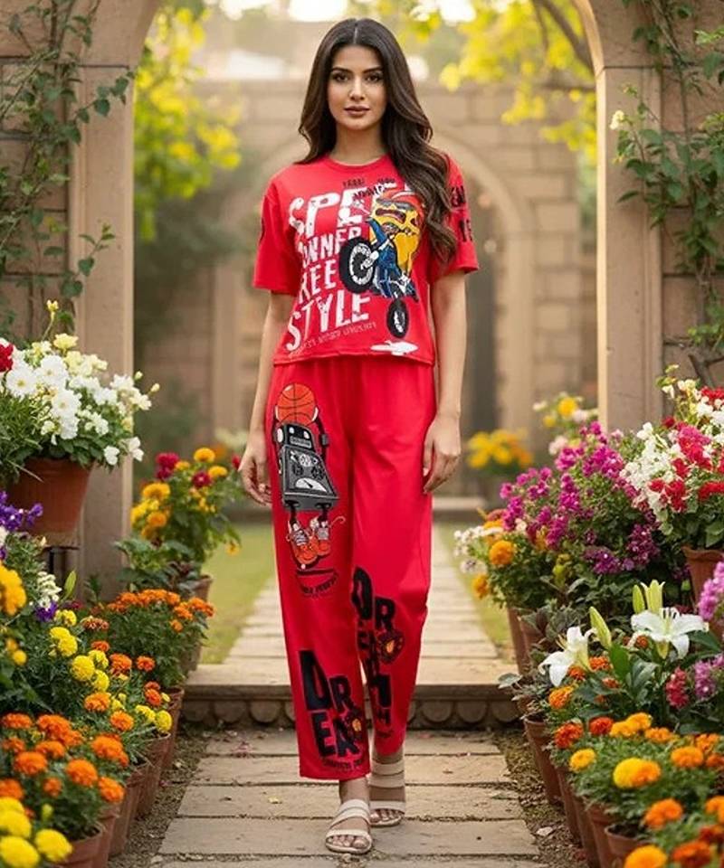 Red Poly Cotton Blend Multi Colour Sporty Free Size Co Ord Set