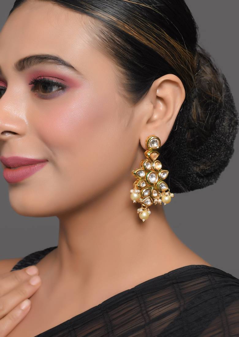 These earrings are designed with a floral arrangement of semiprecious kundan , set in a traditional layout with a smooth gold-tone finish. The base features hanging pearl drops that add a soft, elegant movement to the design.