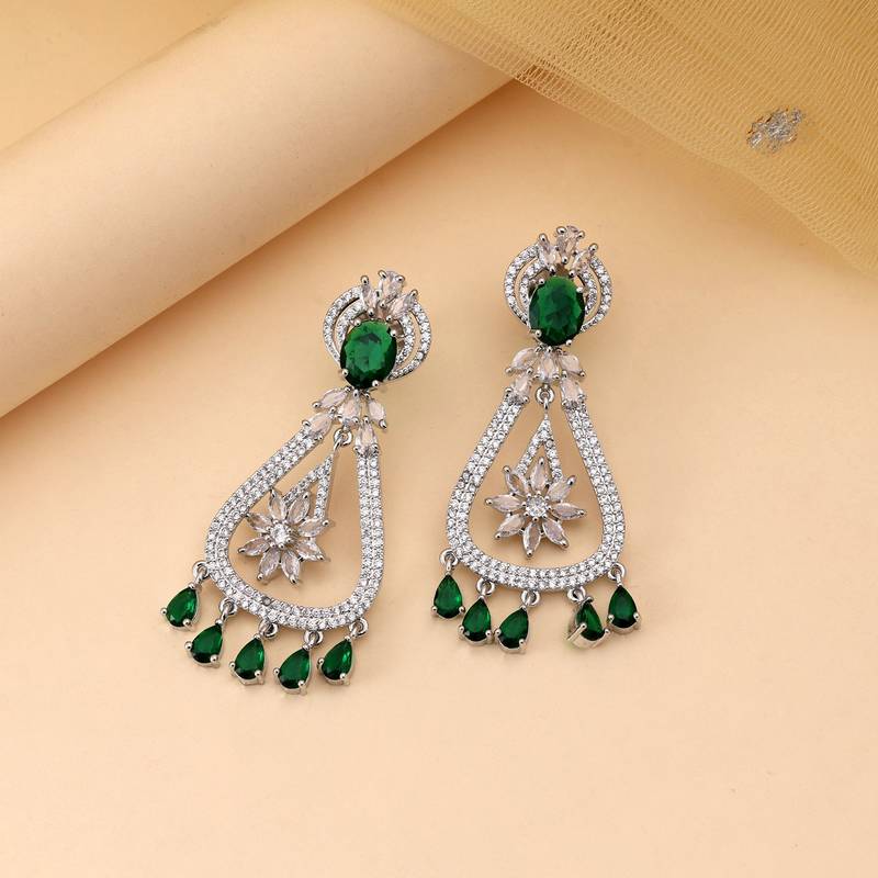 Earring Length: 6.00 CM x Width: 2.50 CM | Metal: Brass With Good Quality Silver Plated | Color: Green | Stone: American Diamond | Gross Weight: 23.00 Grams | Package Content: 1 Pair Of Earring | Back Finding: Post With Friction Back x Earring Style: Dangle