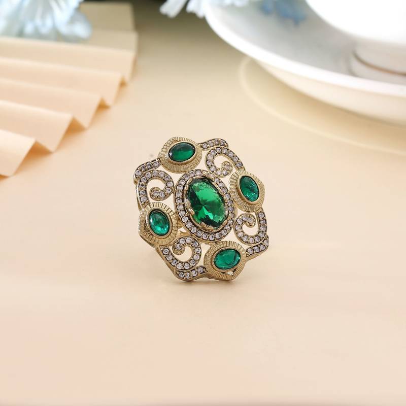 Ring Size: Adjustable | Diameter Length: 3.50 CM x Width: 3.30 CM | Metal: Brass With Good Quality Apala Polish // Mehandi Gold Plated | Color: Green | Stone: American Diamond & Monalisa Stone | Gross Weight: 10.00 Grams | Package Content: 1 Piece Of Rings