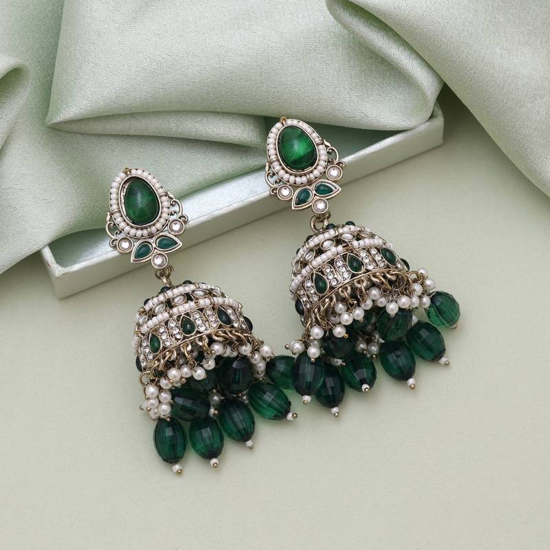 Earring Length: 7.50 CM x Width: 3.00 CM | Metal: Alloy With Good Quality Mehendi Gold Plated | Color: Green | Stone: Kundan & Imitation Pearl | Gross Weight: 65.00 Grams | Package Content: 1 Pair Of Earrings | Back Finding: Post With Friction Back x Earring Style: Jhumka