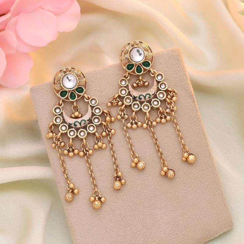 Earring Length: 7.70 CM x Width: 3.00 CM | Metal: Alloy With Good Quality Matte Gold Plated | Color: Green | Stone: Glass Stone & Beads | Gross Weight: 32.00 Grams | Package Content: 1 Pair Of Earring | Back Finding: Post With Friction Back x Earring Style: Dangle