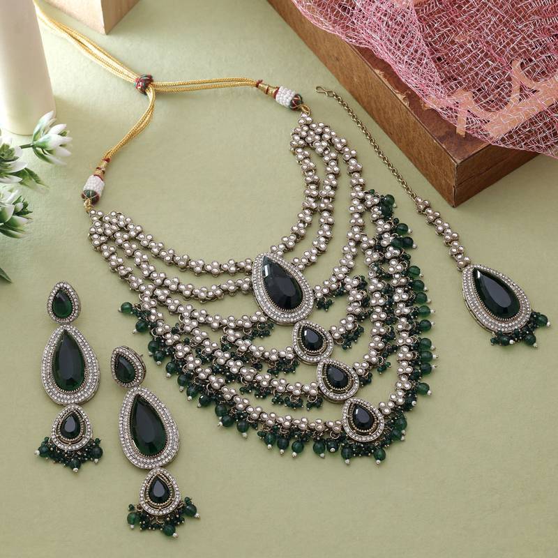Adjustable Rope | Necklace Length: 38.00 CM x Width: 12.50 CM | Earring Length: 10.20 CM x Width: 2.60 CM | Maang Tikka Length: 18.00 CM x Width: 2.60 CM | Metal: Alloy With Good Quality Mehandi Gold Plated | Color: Green | Stone: Kundan & Imitation Pearl | Gross Weight: 205.00 Grams | Package Content: 1 Piece Of Necklace::1 Pair Of Earrings::1 Piece Of Maang Tikka | Back Finding: Post With Friction Back x Earring Style: Dangle