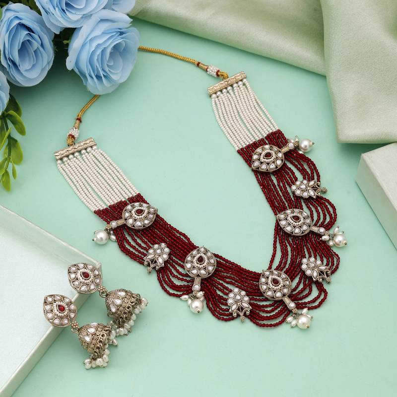 Adjustable Rope | Necklace Length: 28.00 CM x Width: 3.80 CM | Earring Length: 5.00 CM x Width: 2.00 CM | Metal: Alloy With Good Quality Mehndi Gold Plated | Color: Maroon | Stone: Kundan & Beads | Gross Weight: 88.00 Grams | Package Content: 1 Piece Of Necklace::1 Pair Of Earrings | Back Finding: Post With Friction Back x Earring Style: Jhumki