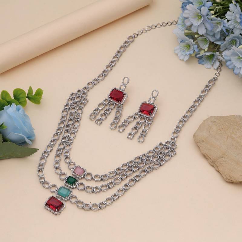 Adjustable Chain | Necklace Length: 40.00 CM x Width: 6.00 CM | Earring Length: 6.80 CM x Width: 2.30 CM | Metal: Brass With Good Quality Silver Plated | Color: Multi | Stone: American Diamond | Gross Weight: 103.00 Grams | Package Content: 1 Piece Of Necklace:: 1 Pair Of Earring | Back Finding: Post With Friction Back x Earring Style: Dangle