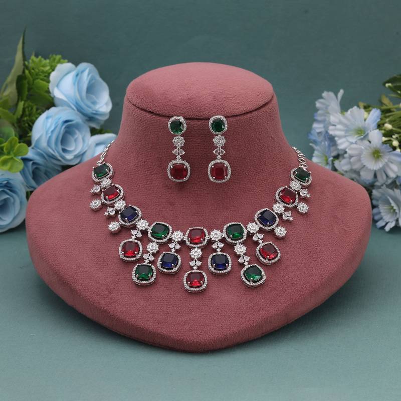 Adjustable Chain | Necklace Length: 21.00 CM x Width: 4.50 CM | Earring Length: 4.20 CM x Width: 1.40 CM | Metal: Brass With Good Quality Silver Plated | Color: Multi | Stone: American Diamond | Gross Weight: 73.00 Grams | Package Content: 1 Piece Of Necklace:: 1 Pair Of Earring | Back Finding: Post With Friction Back x Earring Style: Drop