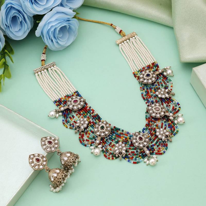 Adjustable Rope | Necklace Length: 28.00 CM x Width: 3.80 CM | Earring Length: 5.00 CM x Width: 2.00 CM | Metal: Alloy With Good Quality Mehndi Gold Plated | Color: Multi | Stone: Kundan & Beads | Gross Weight: 88.00 Grams | Package Content: 1 Piece Of Necklace::1 Pair Of Earrings | Back Finding: Post With Friction Back x Earring Style: Jhumki