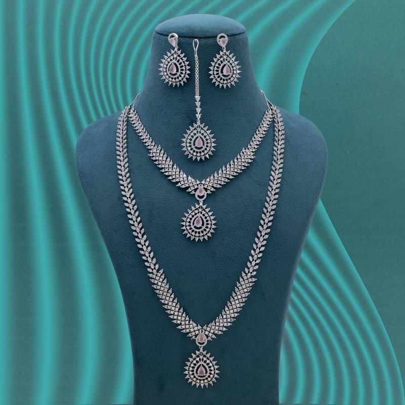 Chain Length: 16.00 CM | Necklace Length:_1: 44.00 CM x Width: 1.30 CM | Necklace Length:_2: 20.00 CM x Width: 1.20 CM | Earring Length: 4.30 CM x Width: 2.40 CM | Maang Tikka Length: 9.50 CM x Width: 2.70 CM | Metal: Brass With Good Quality Silver Plated | Color: Pink | Stone: American Diamond | Gross Weight: 121.00 Grams | Package Content: 2 Pieces Of Necklace:: 1 Pair Of Earring:: 1 Piece Of Maang Tikka | Back Finding: Post With Friction Back x Earring Style: Dangle