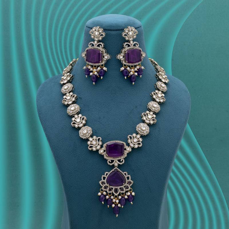 Purple Color Long American Diamond Necklace Set