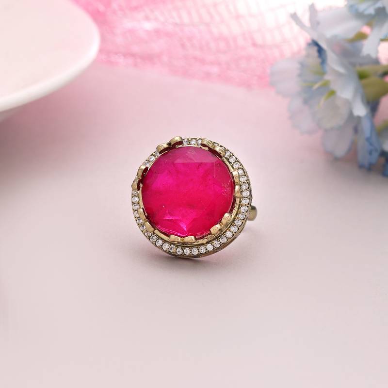 Ring Size: Adjustable | Diameter Length: 2.50 CM x Width: 2.50 CM | Metal: Brass With Good Quality Apala Polish // Mehandi Gold Plated | Color: Rani | Stone: American Diamond & Monalisa Stone | Gross Weight: 9.00 Grams | Package Content: 1 Piece Of Rings