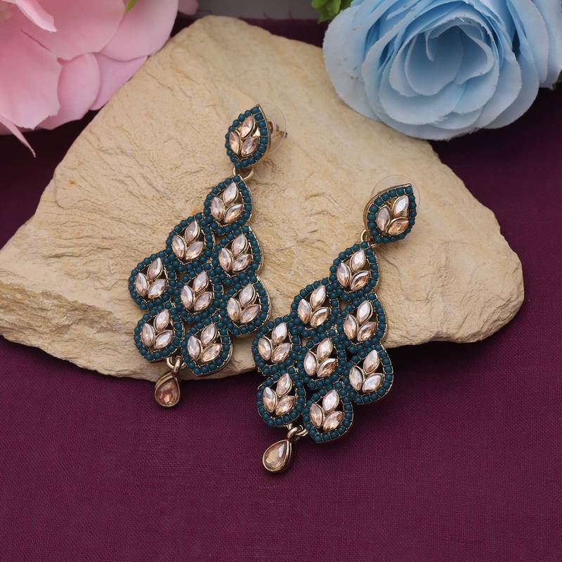 Earring Length: 7.00 CM x Width: 3.20 CM | Metal: Alloy With Good Quality Gold Plated | Color: Turquoise Blue | Stone: Glass Stone | Gross Weight: 20.00 Grams | Package Content: 1 Pair Of Earring | Back Finding: Post With Friction Back x Earring Style: Dangle