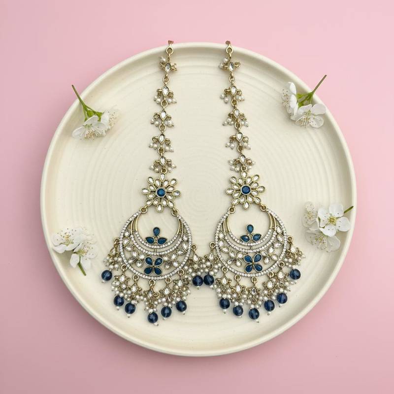 Chain Length: 8.50 CM | Earring Length: 10.50 CM x Width: 5.50 CM | Metal: Alloy With Good Quality Mehendi Gold Plated | Color: Turquoise Blue | Stone: Kundan & Imitation Pearl | Gross Weight: 80.00 Grams | Package Content: 1 Pair Of Earrings | Back Finding: Post With Friction Back x Earring Style: Dangle
