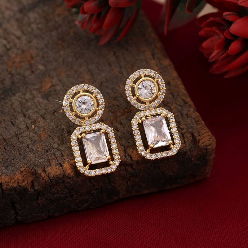 Earring Length: 2.50 CM x Width: 1.20 CM | Metal: Brass With Good Quality Gold Plated | Color: White | Stone: American Diamond | Gross Weight: 8.00 Grams | Package Content: 1 Pair Of Earring | Back Finding: Post With Friction Back x Earring Style: Drop