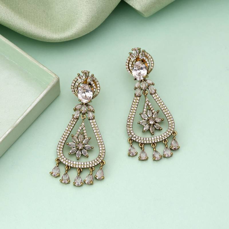 Earring Length: 6.00 CM x Width: 2.50 CM | Metal: Brass With Good Quality Mehendai Gold Plated | Color: White | Stone: American Diamond | Gross Weight: 23.00 Grams | Package Content: 1 Pair Of Earring | Back Finding: Post With Friction Back x Earring Style: Dangle
