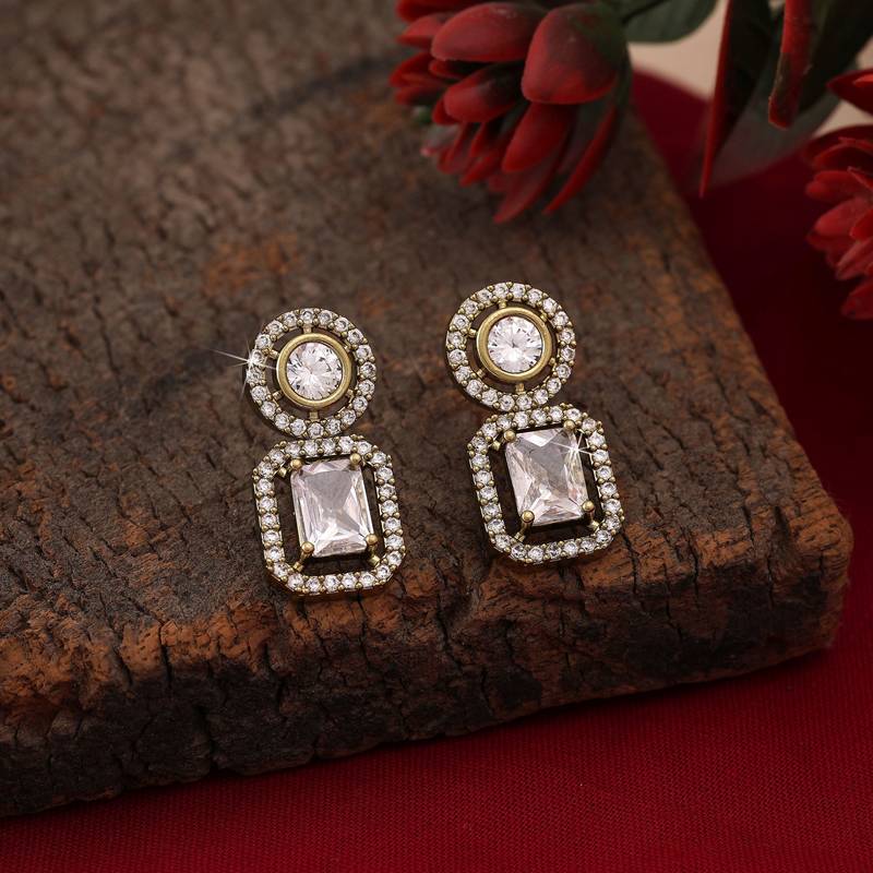 Earring Length: 2.50 CM x Width: 1.20 CM | Metal: Brass With Good Quality Mehendai Gold Plated | Color: White | Stone: American Diamond | Gross Weight: 8.00 Grams | Package Content: 1 Pair Of Earring | Back Finding: Post With Friction Back x Earring Style: Drop