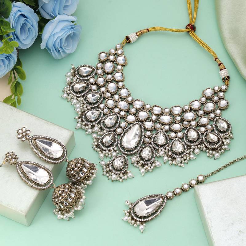 • Product Id : 4698821 • Package Details : 1 Piece Of Necklace/1 Pair Of Earrings/1 Piece Of Maang Tikka • Type : Necklace Sets • Occasion : Wedding • Look : Designer • Jewellery Work : Kundan • Color : White • Plating : Antique Gold • Base Material : Alloy • Piercing : No • Pearl Type : Na • Pearl Shape : Na • Height : 18.0 • Width : 9.0 • Speciality : Jewellry Can Be Used On Birthday, Marriage, Engagement, Any Occasion. • Care : Care Instruction : Avoid Heat & Chemicals Like Perfume, Deo, Alcohol, Etc. | Clean With Dry Cotton Cloth | Pack In An Air Tight Container After Use. • Finish : Glossy Payments [+]