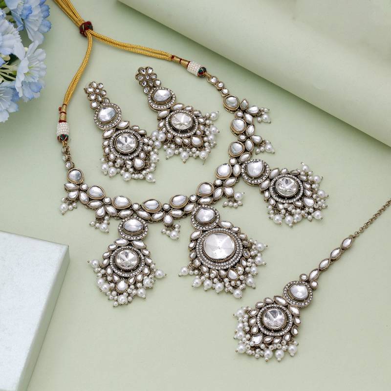 • Product Id : 4698868 • Package Details : 1 Piece Of Necklace/1 Pair Of Earrings/1 Piece Of Maang Tikka • Type : Necklace Sets • Occasion : Wedding • Look : Designer • Jewellery Work : Kundan • Color : White • Plating : Antique Gold • Base Material : Alloy • Piercing : No • Pearl Type : Na • Pearl Shape : Na • Height : 22.0 • Width : 7.5 • Speciality : Jewellry Can Be Used On Birthday, Marriage, Engagement, Any Occasion. • Care : Care Instruction : Avoid Heat & Chemicals Like Perfume, Deo, Alcohol, Etc. | Clean With Dry Cotton Cloth | Pack In An Air Tight Container After Use. • Finish : Glossy Payments [+]