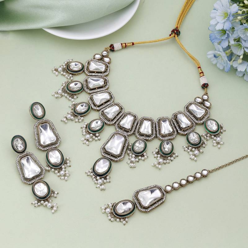 • Product Id : 4698828 • Package Details : 1 Piece Of Necklace/1 Pair Of Earrings/1 Piece Of Maang Tikka • Type : Necklace Sets • Occasion : Wedding • Look : Designer • Jewellery Work : Kundan • Color : White • Plating : Antique Gold • Base Material : Alloy • Piercing : No • Pearl Type : Na • Pearl Shape : Na • Height : 22.0 • Width : 10.5 • Speciality : Jewellry Can Be Used On Birthday, Marriage, Engagement, Any Occasion. • Care : Care Instruction : Avoid Heat & Chemicals Like Perfume, Deo, Alcohol, Etc. | Clean With Dry Cotton Cloth | Pack In An Air Tight Container After Use. • Finish : Glossy Payments [+]