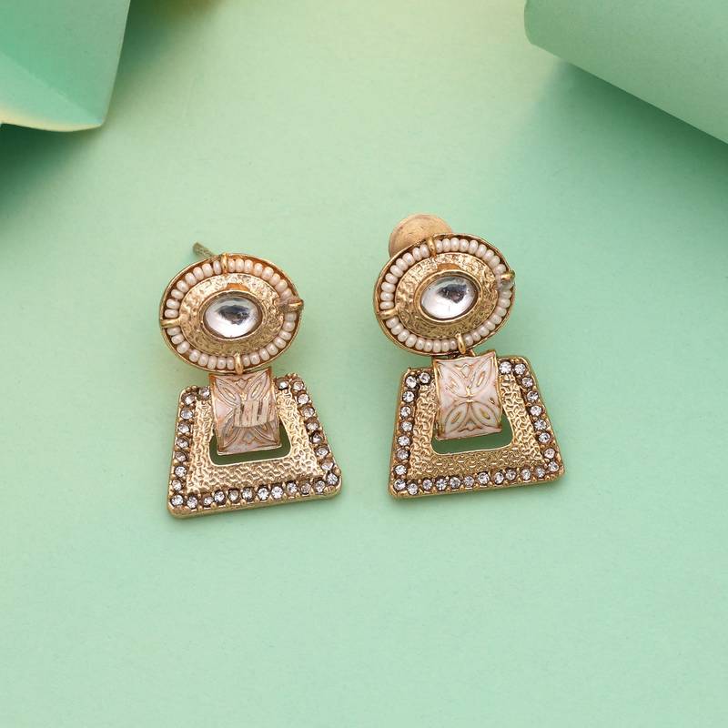 Earring Length: 3.00 CM x Width: 2.10 CM | Metal: Alloy With Good Quality Matte Gold Plated | Color: White | Stone: Glass Stone & Beads | Gross Weight: 14.00 Grams | Package Content: 1 Pair Of Earring | Back Finding: Post With Friction Back x Earring Style: Dangle