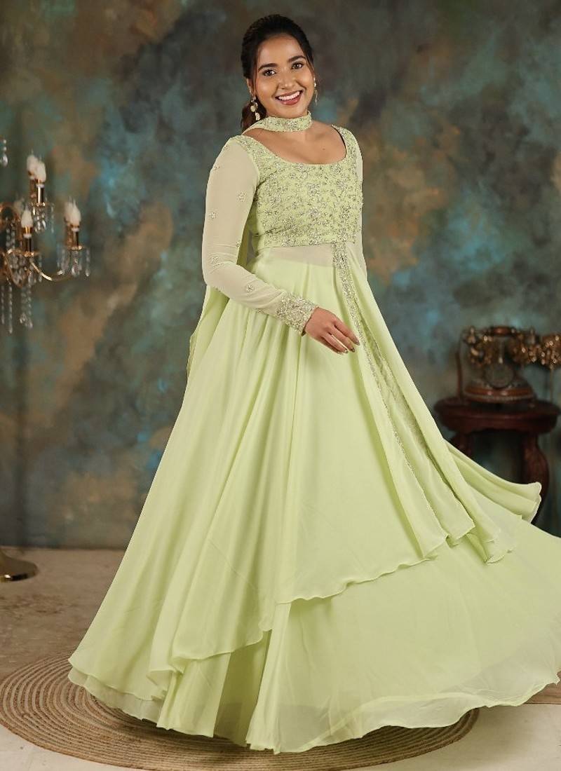 Lime Green Georgette Slit Anarkali Paired With Skirt And Choker Dupatta