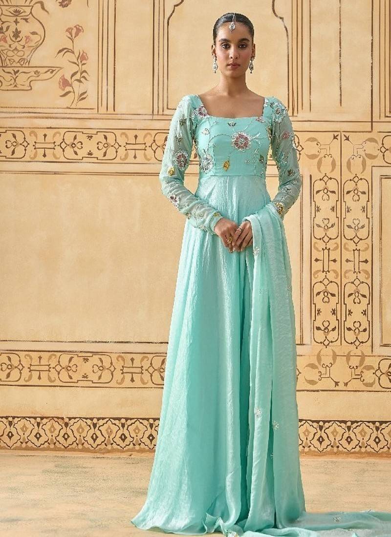 Sky Blue Floral Embroidered Anarkali With Dupatta