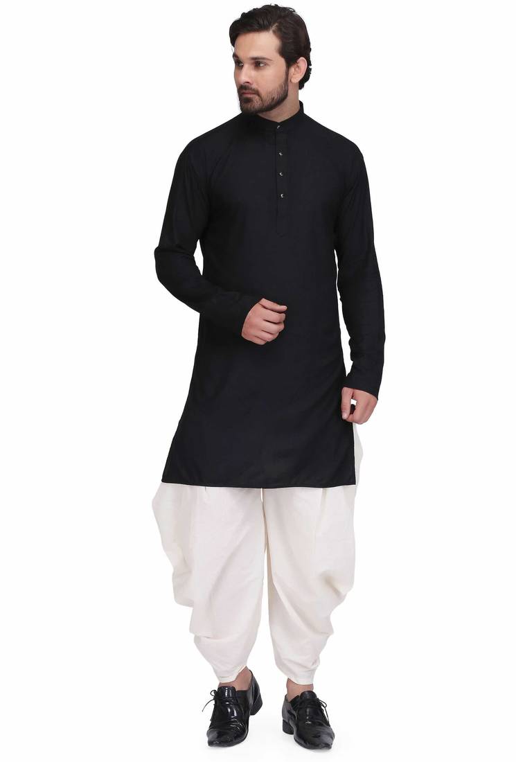 • Product Id : 4757154 • Package Details : 1 Kurta / 1 Dhoti Style Salwar • Type : Dhoti Kurta • Region : Indian • Fabric : Rayon • Work : Plain • Look : Traditional • Sleeve : Full Sleeve • Neck Style : Chinese Collar Kameez • Color : Black • Bottom Fabric : Cotton • Bottom Color : White • Top Color : Black • Top Fabric : Cotton,Rayon • Bottom Style : Dhoti • Stitching : Stitched General - Color and Texture may have slight variation. This happens because of photography.