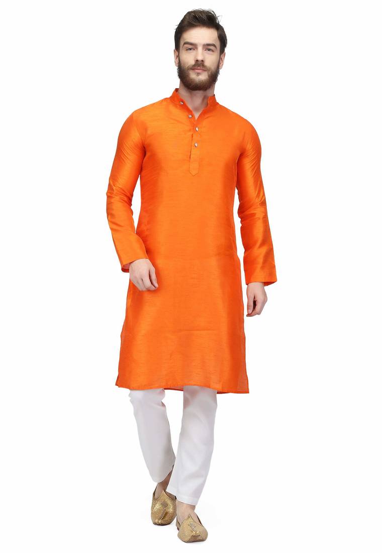 • Product Id : 4741616 • Package Details : 1 Kurta / 1 Pajama • Type : Kurta Pajama • Region : Indian • Occasion : Casual • Work : Plain • Look : Traditional • Bottom Style : Trouser • Sleeve : Full Sleeve • Neck Style : High Neck • Fabric : Raw Silk • Color : Orange • Bottom Fabric : Cotton • Bottom Color : White • Top Color : Brown • Top Fabric : Raw Silk • Stitching : Stitched General - Color and Texture may have slight variation. This happens because of photography.