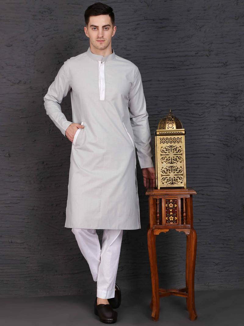 Men's Light Grey Cotton Kurta With Pant Set