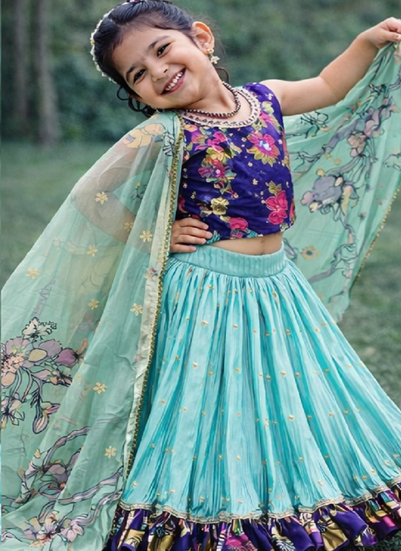 • Product Id : 4627192 • Package Details : 1 Lehenga/1 Choli/1 Dupatta • Type : Kids Lehenga Choli • Occasion : Festive • Work : Printed • Type : Anarkali Suits • Look : Fashion • Sleeve : Sleeveless • Neck Style : V Neck • Bottom Fabric : Silk • Bottom Color : Sky Blue • Top Color : Blue • Top Fabric : Silk • Chunari Fabric : Silk • Chunari Color : Green • Bottom Style : Afghani • Stitching : Stitched • Gender : Girl • Chunari Length : 55 Inch Payments [+]