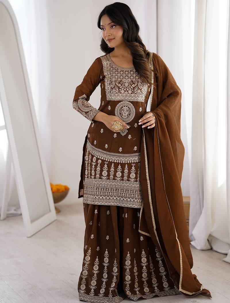 Chocolate Brown Crunchy Silk Embroidered Kurta Palazzo Set Stitched