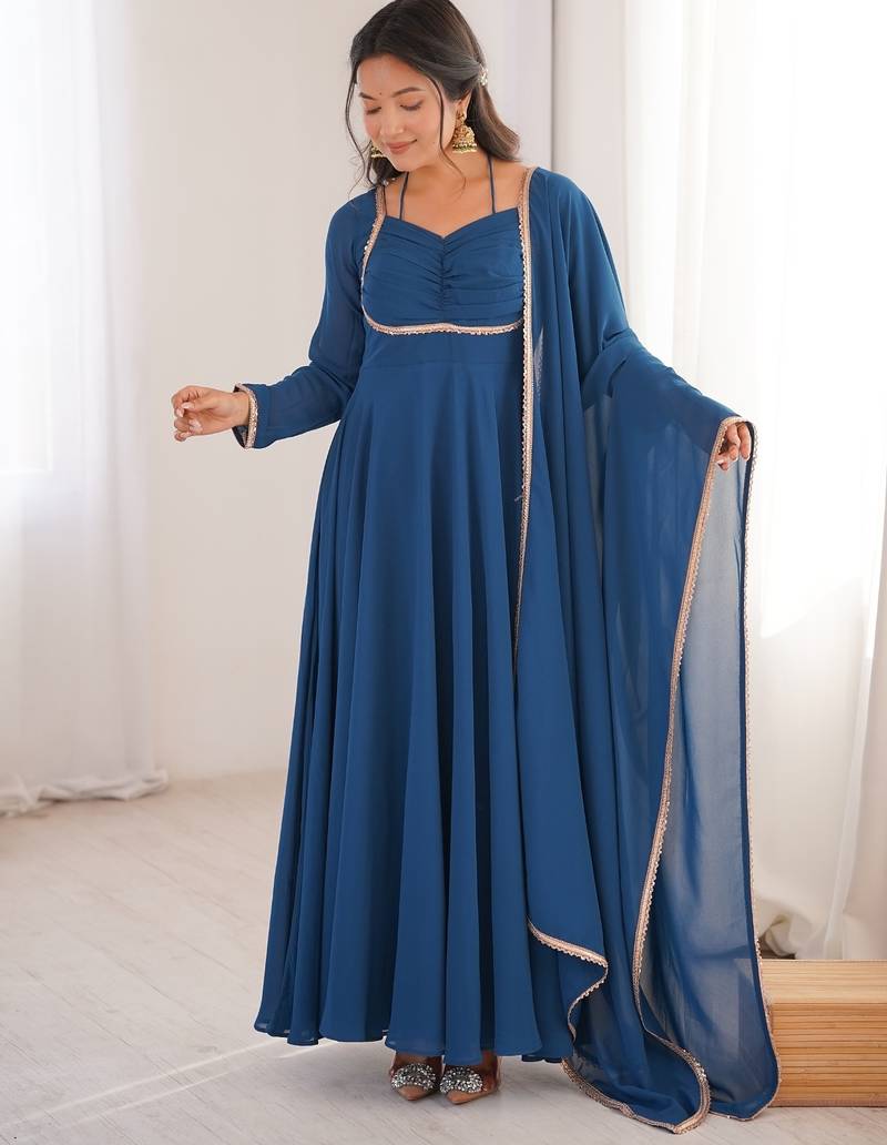 Beautiful teal Anarkali gown in heavy fox blooming georgette with 7+ meter flare, designer padded dori neck yoke, full sleeves, cotton inner, and lace-bordered dupatta.