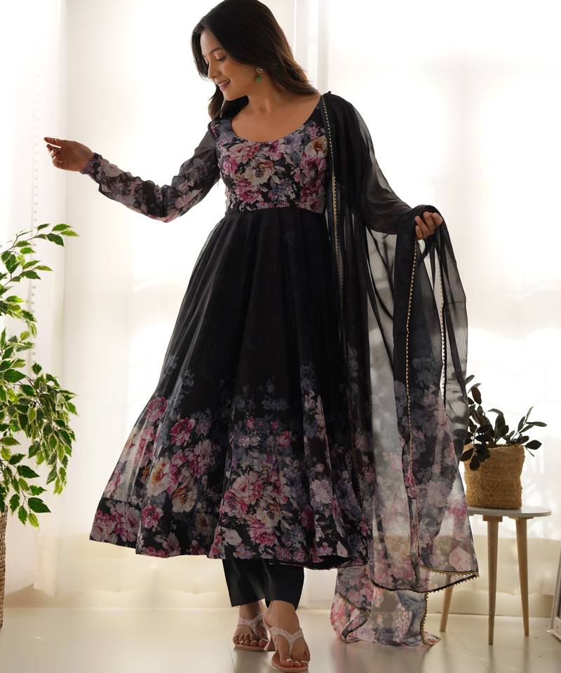 Black Organza Floral Print Anarkali Set With Floral Print Dupatta And Pant