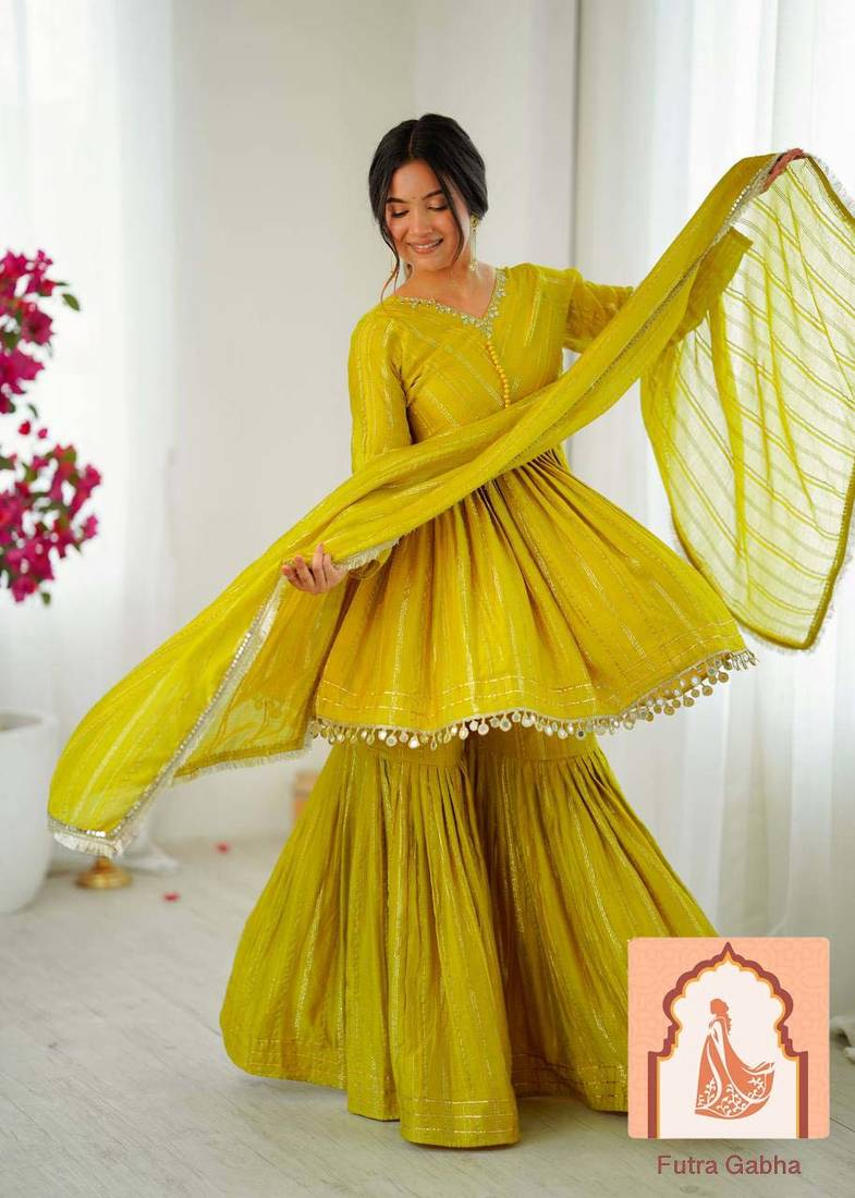 • Product Id : 4668179 • Package Details : 1 Gown 1 Bottom 1 Dupatta • Type : Kurta Sets • Occasion : Party Wear • Type : Sequins Work • Look : Fashion • Sleeve : Full Sleeve • Neck Style : V Neck • Fabric : Chanderi • Color : Lemon • Work : Lace • Stitching : Stitched Payments [+]