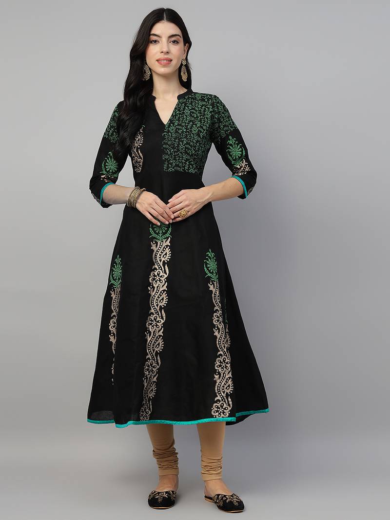 • Product Id : 4707837 • Package Details : 1 Anarkali • Type : Long Kurti Designs • Region : Kerla • Occasion : Casual • Fabric : Cotton • Work : Printed • Type : Block Print • Look : Traditional • Sleeve : Quarter Sleeve • Color : Black • Stitching : Stitched • Neck Style : Mandarin Collar • Length : 48.0 Payments [+]