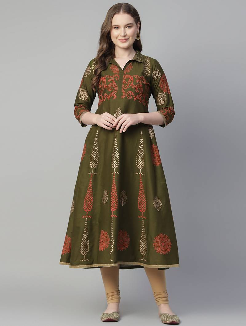 Dark Mehndi Cotton Printed Anarkali Kurta