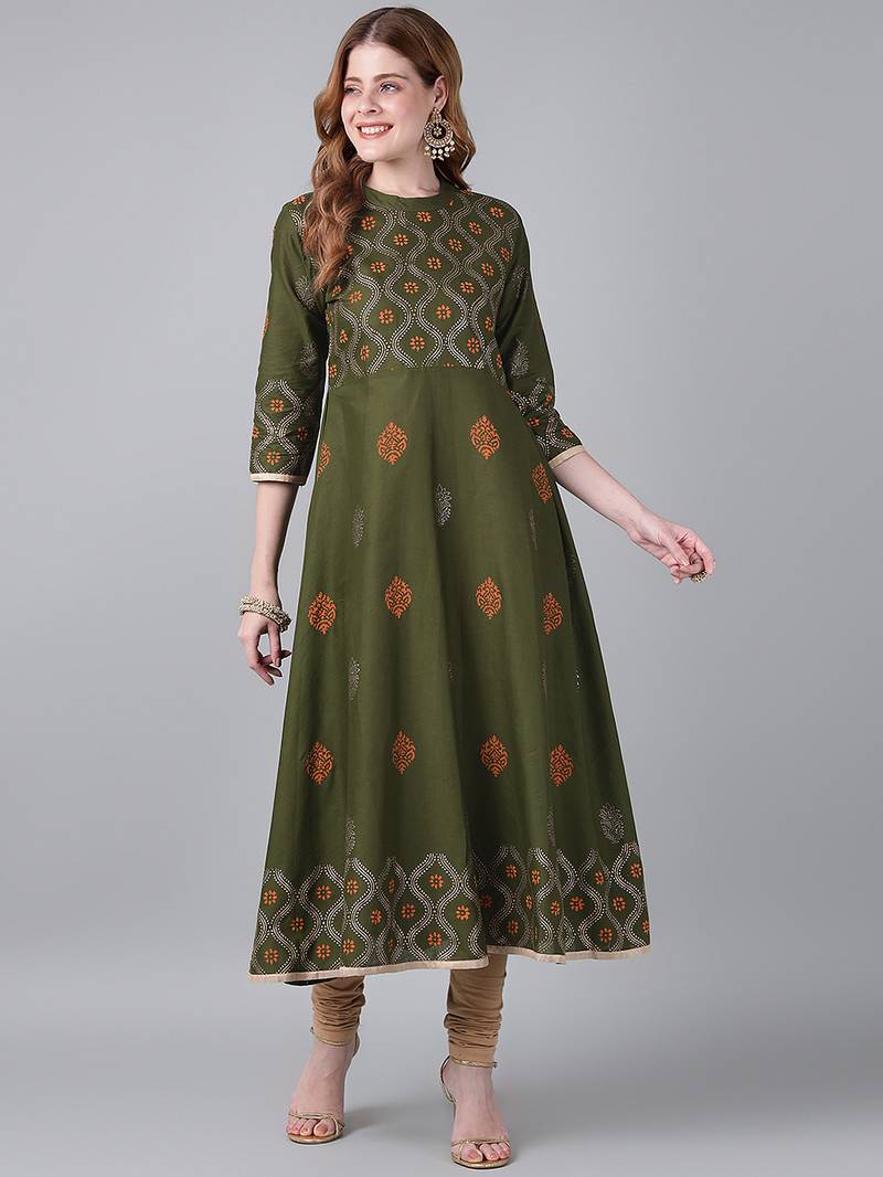 • Product Id : 4707813 • Package Details : 1 Anarkali • Type : Long Kurti Designs • Region : Kerla • Occasion : Casual • Fabric : Cotton • Work : Printed • Type : Block Print • Look : Traditional • Sleeve : Quarter Sleeve • Neck Style : High Neck • Color : Green • Stitching : Stitched Payments [+]