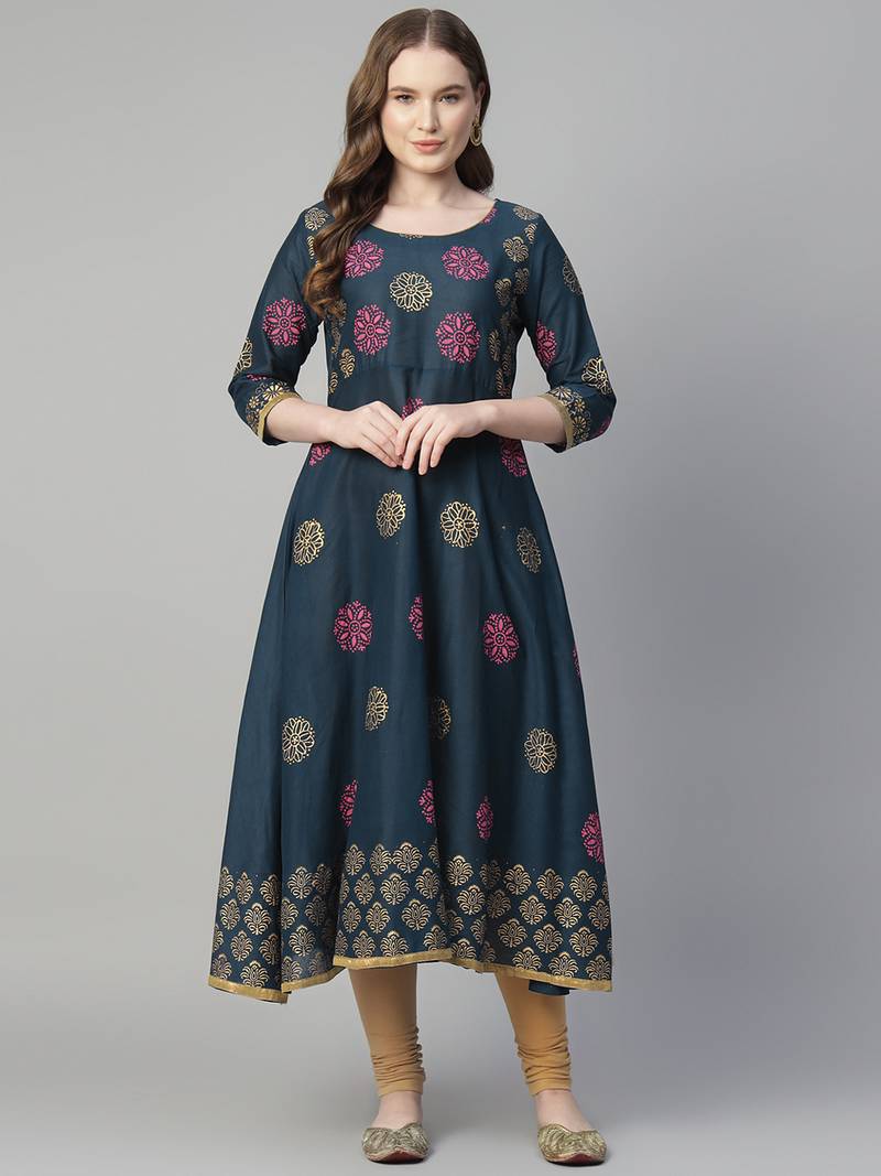 Navy Blue Cotton Printed Anarkali Kurta
