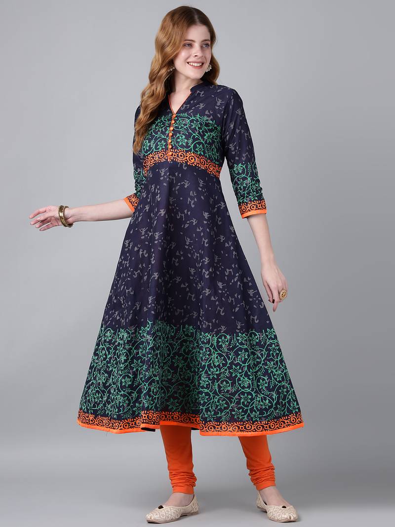 Navy Cotton Printed Anarkali Kurta