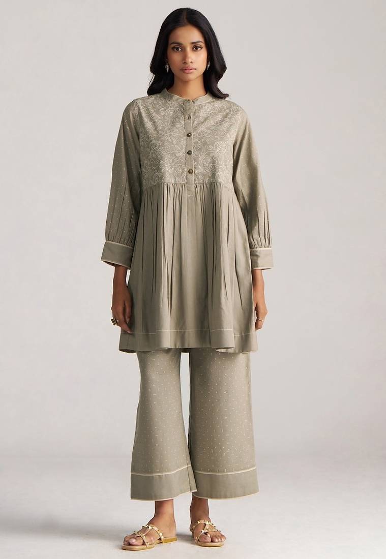 Grey Linen Co Ord Set With Full Sleeve Style