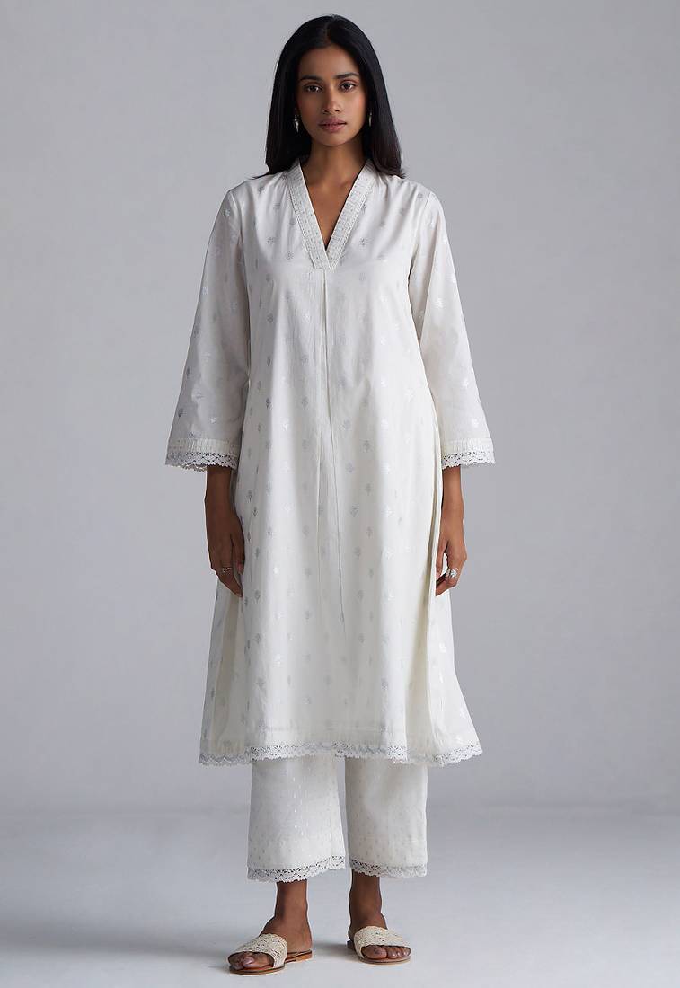 - This set includes foil print kurta with silver dobby
