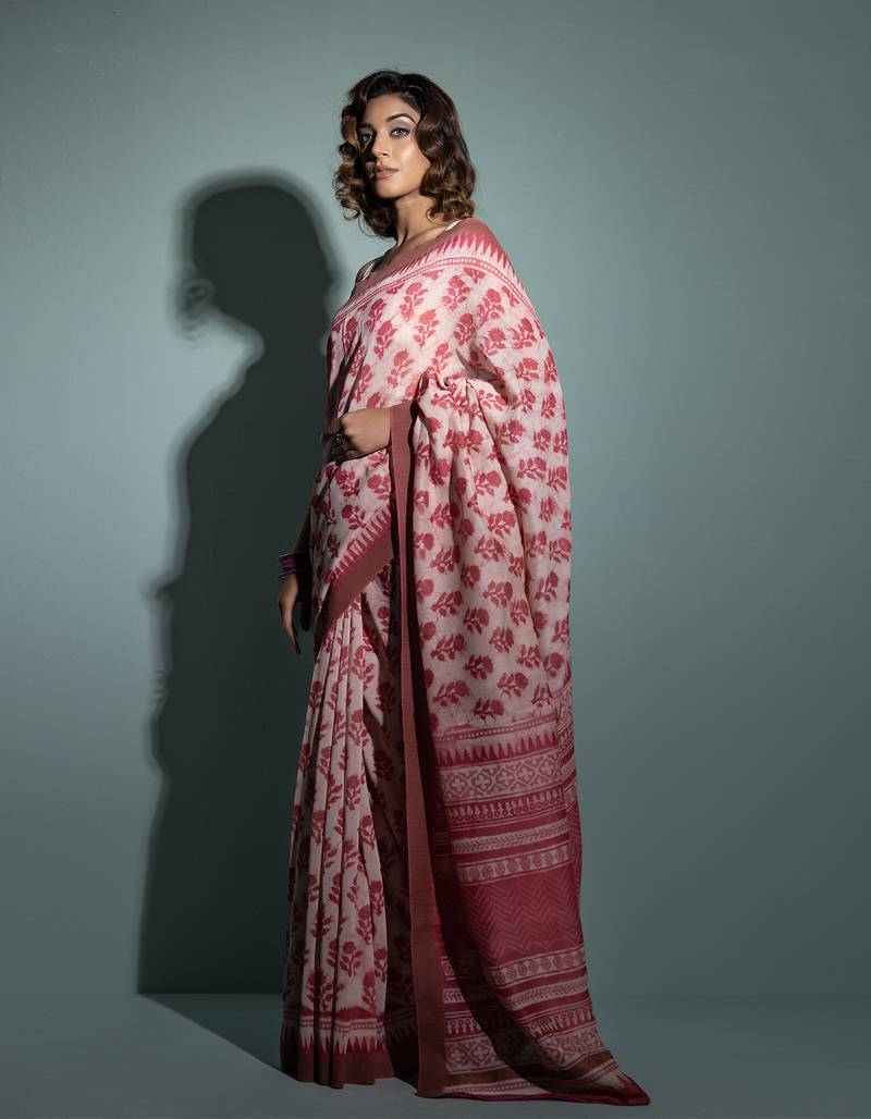Accentuate your wardrobe with this Pink Chanderi Saree crafted with the effort-intensive technique of hand-block printing with natural vegetable dyes. It is inspired by prints of Daabu and is further adorned with a hand-weaved ghicha border and traditional prints in pallu.