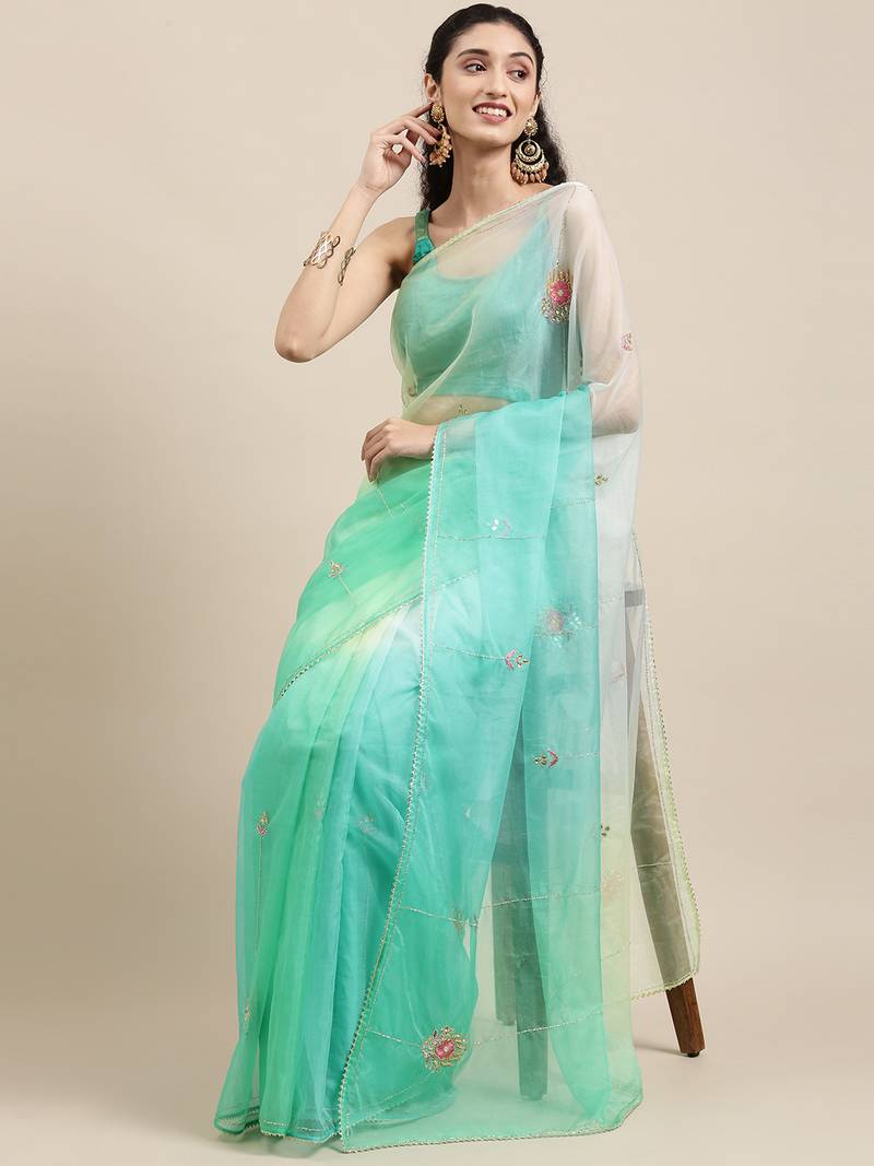 Geroo Jaipur Handcrafted Green Shaded Organza Saree