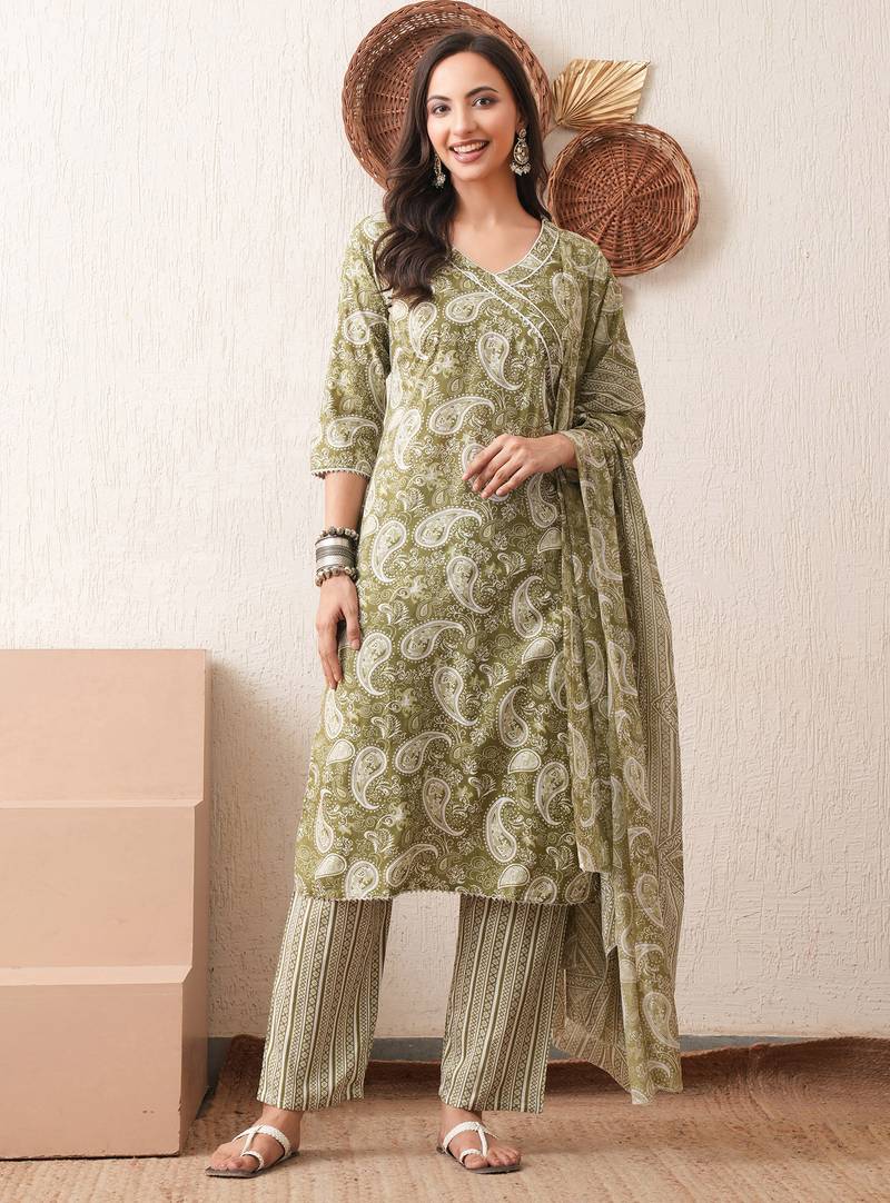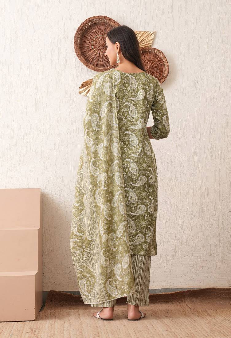 Women Printed Rayon Occasional Green Straight Kurta Pant Dupatta Set