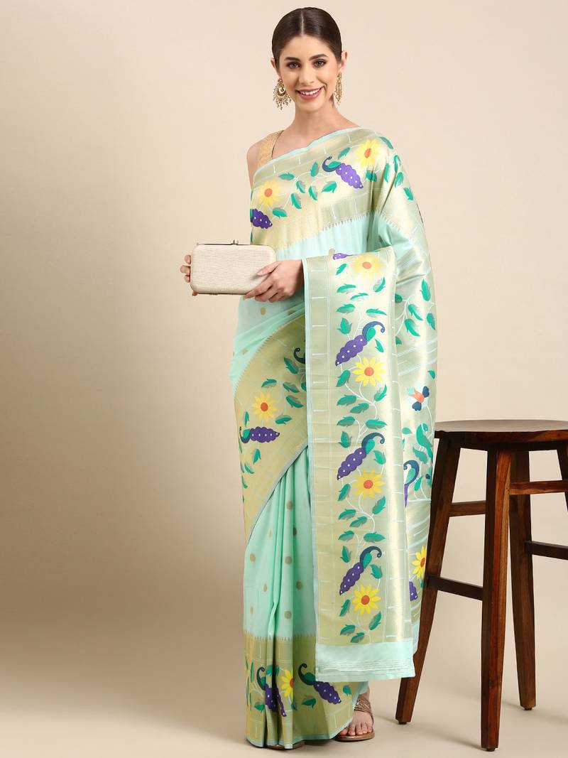 Aqua Blue Woven Paithani Silk Saree With Blouse